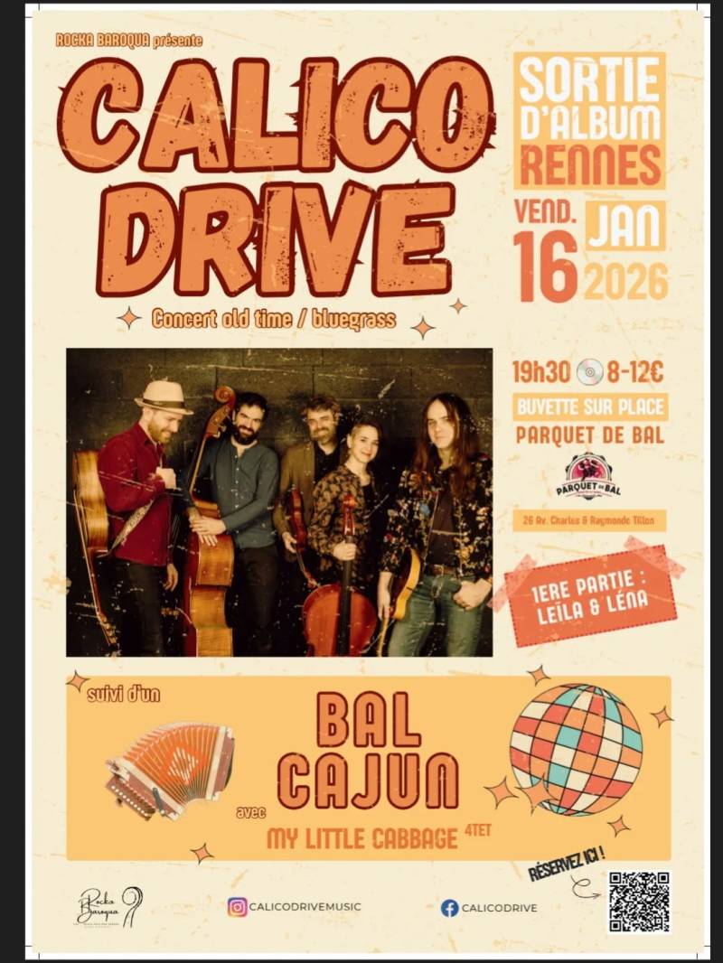 Sortie d'album de Calico Drive, précédé d'un concert de Léna et Leïla et suivi d'un bal cajun. Ca commence à 19 H 30