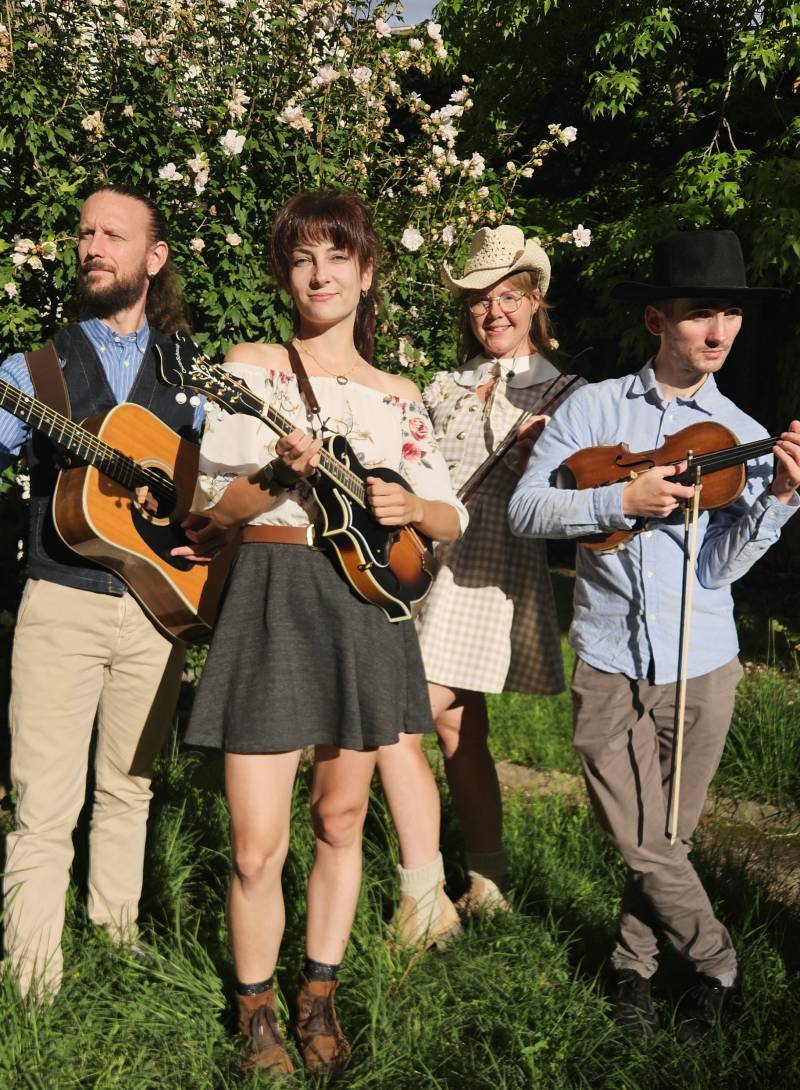 En 2018, je sortais mon 1 EP de composition en solo assez influencé folk/country. Et c’est à ce moment-là que je découvre le Bluegrass et la jam. En parallèle de mon projet de composition, j’ai monté un projet de reprises nommé « Cow Comino Train ». Projet qui a été mon 1er jet en tant qu’instrumentiste bluegrass et m’a permis de faire de grands travaux de repiquages et de beaucoup travailler la guitare. Nous avons eu la chance de jouer nos chansons à La Roche sur la scène des jeunes talents en 2024. Pour mon projet principal, Karoline & the Free Folks, j’ai monté une équipe en 2019 qui a un peu changé au fur à mesure. Le projet a remporté plusieurs tremplins de musiques actuelles en 2019 et 2020. J’ai donc été soutenue par le Kraspek Myzik et la Salle des Rancy pour sortir mon 1er album « Reckless Dances ». Cet album aux sonorités country nous a ouvert des portes de festivals comme Equiblues ou Country à Craponne sur Arzon. En fin 2024, ça faisait longtemps que je rêvais d’avoir mon propre groupe de bluegrass, alors j’ai décidé de le créer. J’ai décidé de repenser la formation de mon groupe, et de dédier l’écriture de mon 2ème album à mon amour grandissant pour cette musique. Je m’occupe moi-même du démarchage, de la communication, de planifier les projets, enregistrements studio etc. mais je travaille depuis 2024 avec une boîte de production, Takaprod, qui gère l’administratif avec les programmateurs.