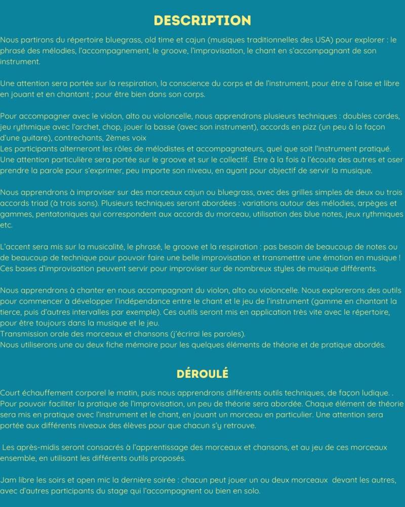 Répertoire Bluegrass, old time et cajun (musiques traditionnelles des USA) comme base de travail